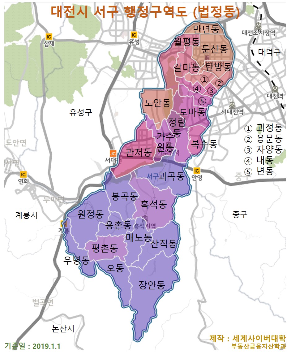 이 부동산정보는 세계사이버대학 부동산금융자산학과 수업 과정에 포함된 부동산투자 실무 중 부동산시장 분석(지역분석) 등에 활용할 목적으로 작성한 것이며, 표에 포함된 각 지역의 위치는 첨부된 행정구역도에서 확인 할 수 있습니다. 기타 각 지역별 아파트 가격 수준을 상호 비교한 결과, 연립주택(빌라)과 다세대주택의 가격 수준 등은 본 블로그 “아파트가격 수준”에 별도로 수록되었으며, 표의 해석과 관련된 상세한 참고자료는 본 블로그 기초자료 메뉴에 등록했습니다.