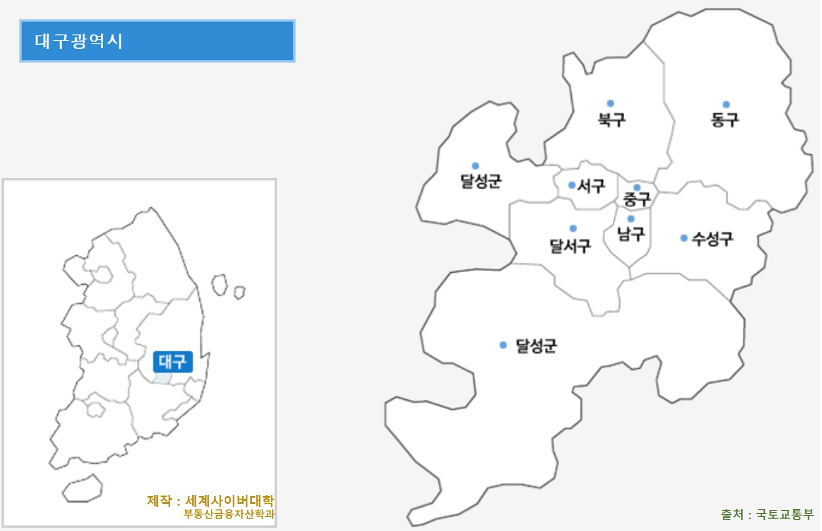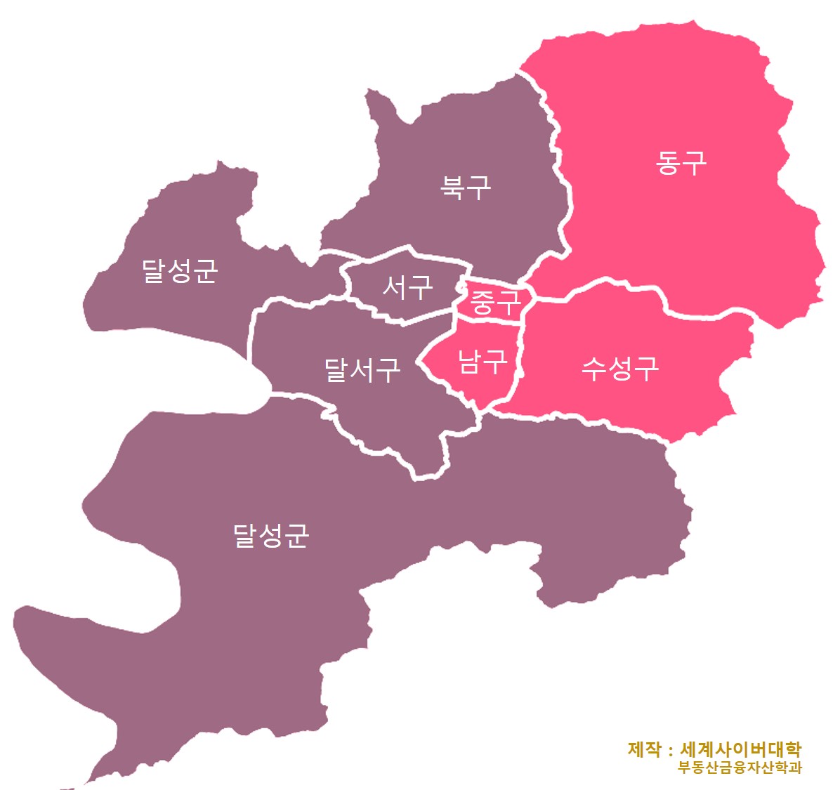 2021년 1월 1일 현재 대구광역시 8개 구군별 아파트 중 가장 비싼(공시가격이 가장 높은) 아파트 목록입니다 (단가가 가장 높은 아파트는 앞 정보 참조). 아래 대구 지역 현황표는 한국감정원에서 조사하여 국토교통부장관이 공표한 2021년 공동주택공시가격 정보(180,668,391건)을 분석하여 작성한 것으로, 부동산투자나 감정평가, 중개 활동 등을 위한 아파트 시장분석에 활용할 수 있습니다. [ 표 ] 대구시 구군별 공시가격이 가장 높은(가장 비싼) 아파트 (2021년 1월 1일 기준) 지역명 공시가격 (만원) 주소 아파트단지 동, 층, 호 명칭 전용면적 (㎥) 동일 금액 세대 수 남구 66,900 봉덕동 1631 래미안웰리스트 101동 18층 1802 165.84 32 달서구 183,200 감삼동 ..
