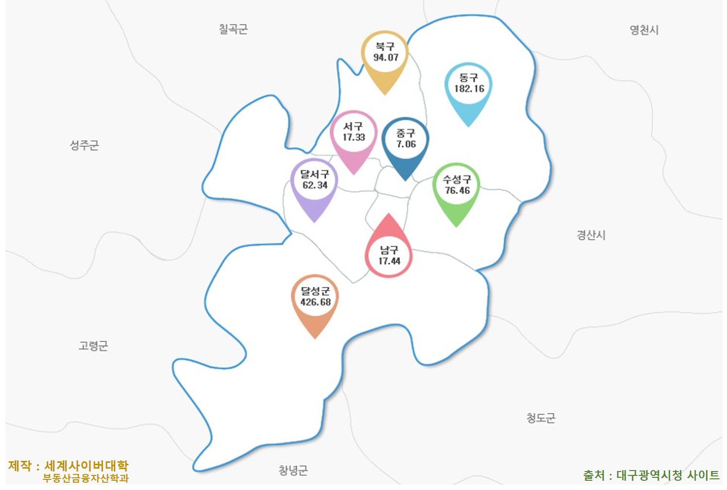 2021년 1월 1일 현재 대구광역시 8개 구군별 표준주택 중 주상용건물의 동당 평균 공시가격 수준 및 순위 표입니다. 대구 지역 주상용건물 가격수준은 국토교통부장관이 감정평가사에게 의뢰하여 산정된 전국 23만 동의 표준주택 가격 정보에 근거하여 작성한 것입니다. [ 표 ] 지역별 주상용건물 평균 공시가격(단위 : 만원, 동, ㎡) 지역명 동당 공시가격 (만원) 가격 순위 공시 주상용건물 동수 대지 평균 면적 (㎡) 건물 평균 연면적 (㎡) 건물 ㎡당 공시가격 (만원) 시도안 전국 남구 21,998 3 67 151 185.5 349.9 62.9 달서구 25,034 2 58 258 201.0 351.6 71.2 동구 19,690 5 80 266 222.0 329.7 59.7 북구 17,725 7 93 29..