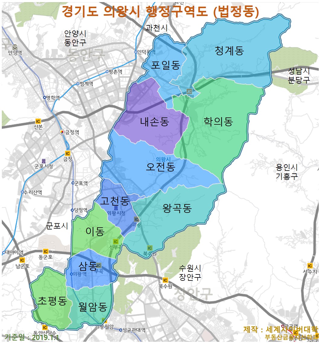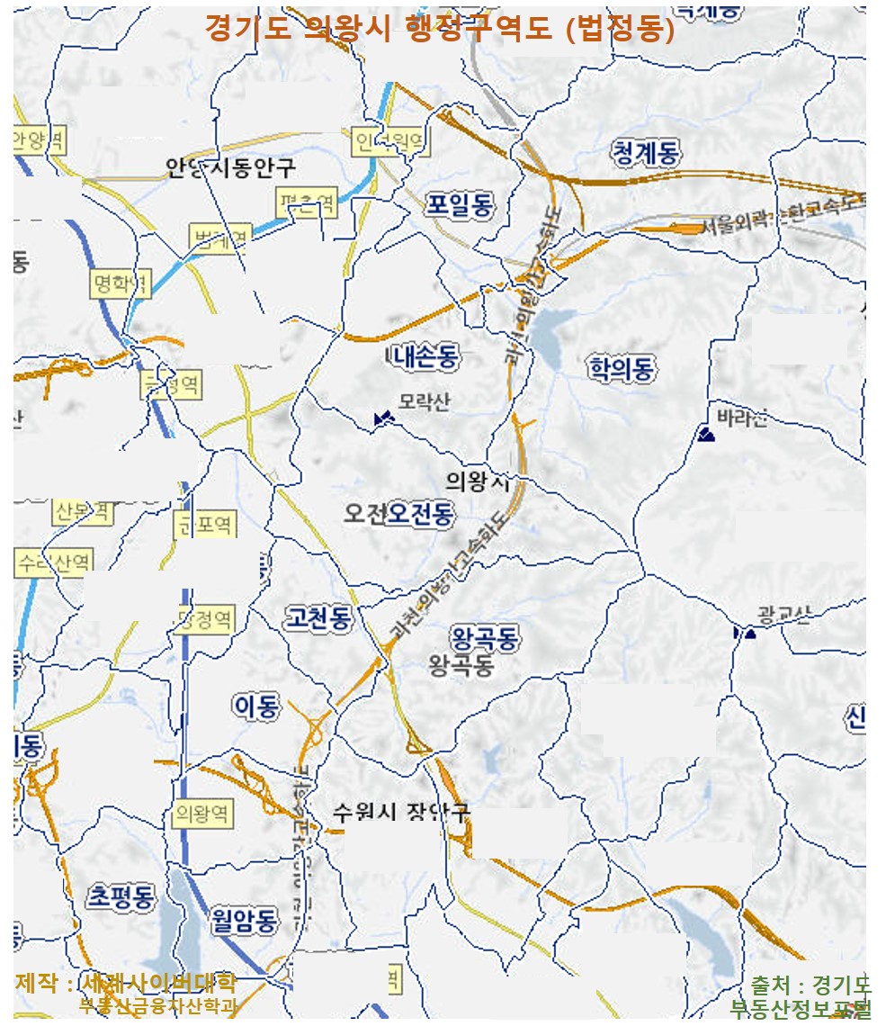 국세청에서 기준시가를 고시한 경기도 의왕시 소재 오피스텔 건물 기준시가 정보를 활용해 추출한 경기도 의왕시 읍면동별 오피스텔 고시가격 정보 중 가장 높은 가격(최고가)의 오피스텔에 대한 정보입니다. 이들 정보는 국세청에서 제공하는 2020년 상업용건물 및 오피스텔 기준시가 정보에 수록된 1,443,701건(상가 570,483건)의 정보 중 경기의왕 소재 오피스텔건물 (복합용건물 포함)에 대해 분석한 결과이며, 각종 오피스텔의 매매나 임대차, 기타 부동산시장 분석 등에 활용될 수 있습니다. [표] 경기도 의왕시 읍면동별 오피스텔 기준시가 최고가 (가장 높은 가격) 목록 지역명 최고 고시가격 (원/㎡) 주소 건물명 및 동ㆍ호 주소 전용면적 (㎡) 공용면적 (㎡) 동일 가격 호수 내손동 1,707,000 73..