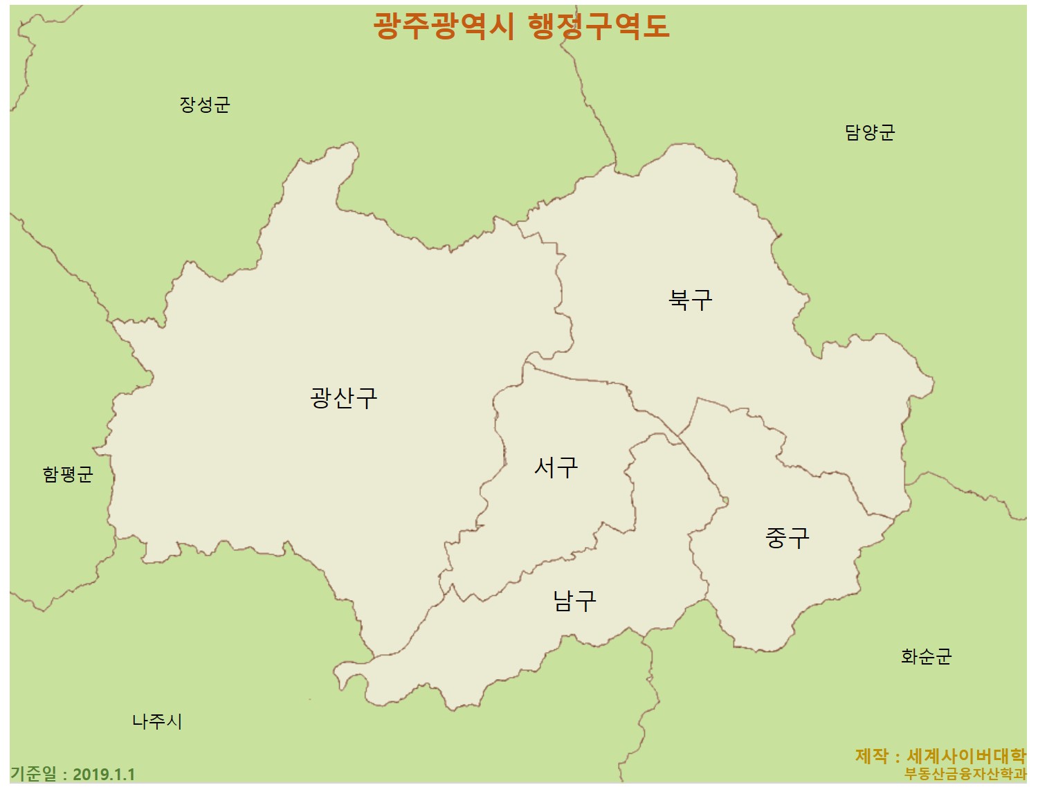 2021년 1월 1일 현재 광주광역시에 있는 5개 시군구별 토지 중 4개 주요 지목 토지의 ㎡당 표준지공시지가 가격수준표입니다. 광주 지역 지가수준 정보는 국토교통부에서 감정평가사에게 의뢰하여 조사한 2021년 표준지공시지가 중 지목이 대, 전, 답, 임야인 토지(499,249필지)를 별도로 분석한 결과입니다. [표 2] 광주시 토지 지목별 평균 표준지공시지가 수준 (단위 : 천원/㎡) 지역명 전체 토지 공시지가 지목별 공시지가 대 전 답 임야 광산구 187.0 855.8 92.5 82.8 10.1 남구 381.8 1,110.7 117.6 81.0 15.9 동구 289.6 1,250.1 98.6 86.5 6.8 북구 235.7 880.6 107.3 102.5 8.0 서구 750.6 1,222.5 224...