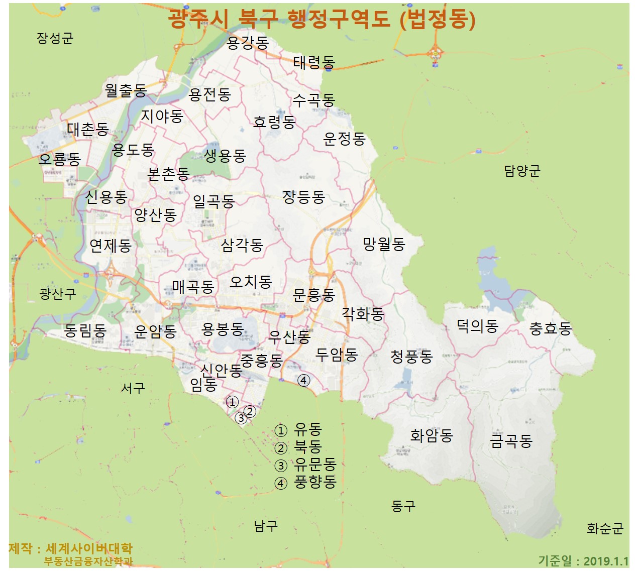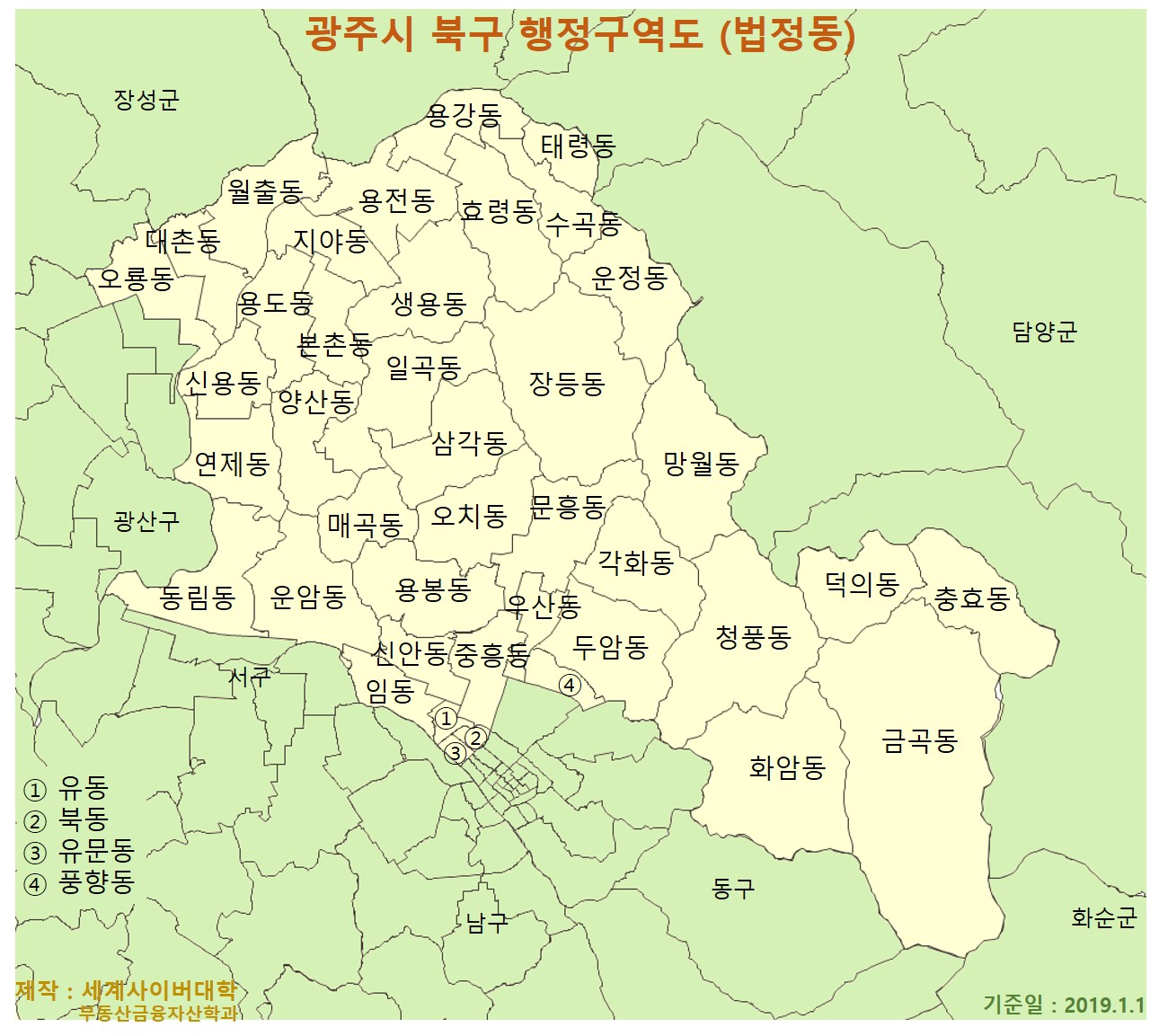 2020년 1월 1일 현재 광주광역시 북구에 있는 41개 읍면동별 토지 중 지목이 대인 토지의 ㎡당 표준지공시지가 가격수준 및 순위 표입니다. 광주 북구 지역 지가수준 정보는 국토교통부에서 감정평가사에게 의뢰하여 조사한 2020년 표준지공시지가 중 지목이 대인 토지(210,822필지)를 별도로 분석한 결과입니다. [표 2] 광주시 북구 토지 중 지목이 대인 토지(대지) 평균 공시지가 및 순위 읍면동명 평균공시지가 (원/㎡) 시군구 내 순위 시도 내 순위 전국 순위 공시 필지수(필) 각화동 952,834 1704 55 5 24 금곡동 222,110 3326 141 34 5 누문동 1,359,068 1227 21 1 37 대촌동 322,102 2970 121 26 4 덕의동 150,000 3618 155 4..