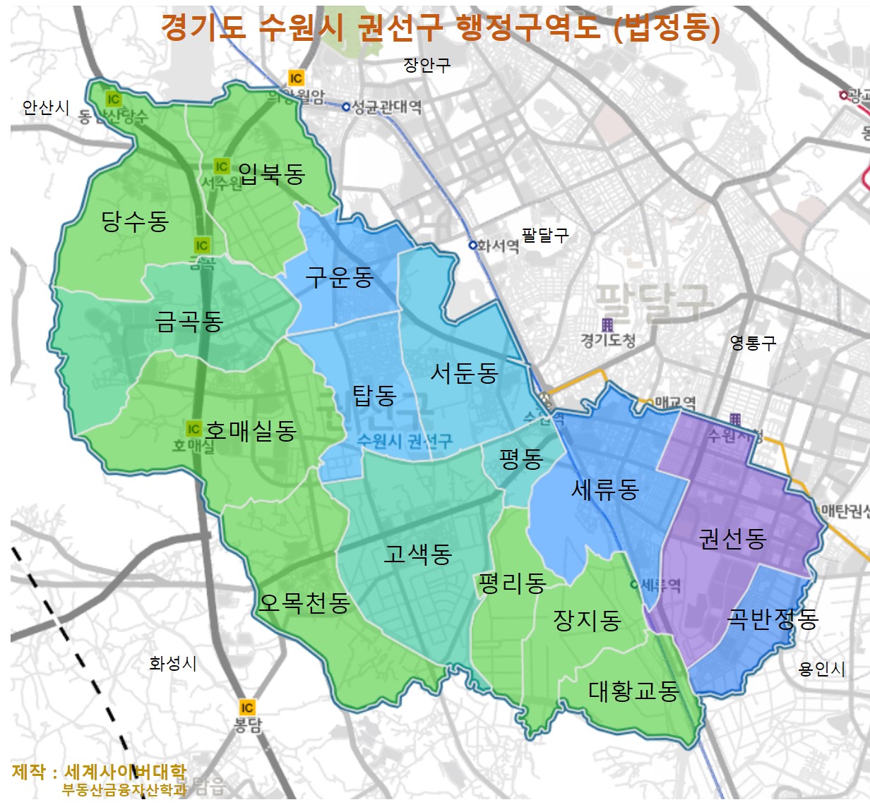 국세청에서 기준시가를 고시한 경기도 수원시 권선구 소재 오피스텔 건물 기준시가 정보를 활용해 추출한 경기도 수원시 권선구 읍면동별 오피스텔 고시가격 정보 중 가장 높은 가격(최고가)의 오피스텔에 대한 정보입니다. 이들 정보는 국세청에서 제공하는 2020년 상업용건물 및 오피스텔 기준시가 정보에 수록된 1,443,701건(상가 570,483건)의 정보 중 경기수원권선 소재 오피스텔건물 (복합용건물 포함)에 대해 분석한 결과이며, 각종 오피스텔의 매매나 임대차, 기타 부동산시장 분석 등에 활용될 수 있습니다. [표] 경기도 수원시 권선구 읍면동별 오피스텔 기준시가 최고가 (가장 높은 가격) 목록 지역명 최고 고시가격 (원/㎡) 주소 건물명 및 동ㆍ호 주소 전용면적 (㎡) 공용면적 (㎡) 동일 가격 호수 권선..